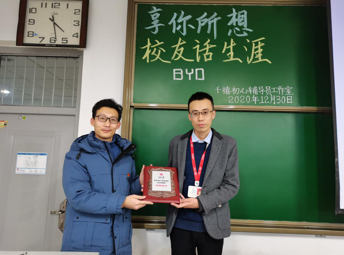 为更好地发挥生涯人物对在校大学生生涯规划的指导作用,“千禧初心”辅导员工作室利用优质校友资源,借助讲座等形式举办校友话生涯系列讲座,丰富大学生获取职业信息的渠道,帮助学生了解和认识社会需求、职业需求、职业环境等基本情况,提升大学生制定合理学涯、生涯规划的能力。2020年12月30日下午3点,“千禧初心”辅导员工作室于15108H成功举办本学期第四期“享你所想,校友话生涯”系列讲座。此次分享的嘉宾是2008年毕业的曹兴刚学长,他现任比亚迪焊装工厂制造部经理。校宣传部赵飞虎老师,千禧初心辅导员工作室成员王子威老师和李宗霖老师出席本次讲座。
