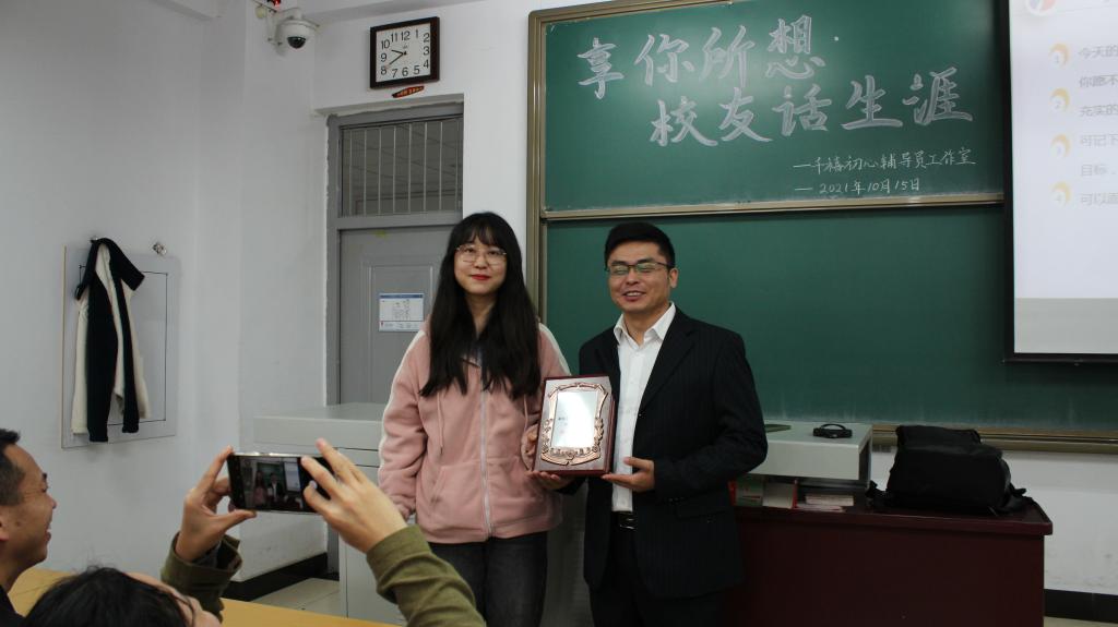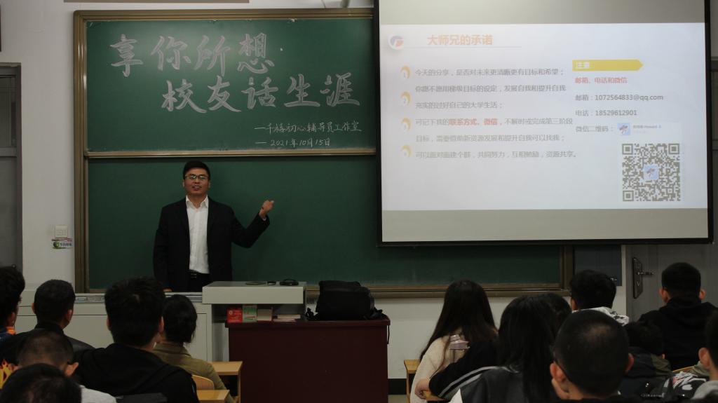 以学校建校80周年为契机,依托“校友导航”育人计划,为形成学校、校友、在校生良性互动的局面,搭建校友与在校学生更多沟通交流平台,进一步扩大校友与在校学生的交流对话,活跃校园文化生活,浓厚校园学术氛围,加强在校学生的思想引导和价值引领,为广大学生启迪智慧、成长导航。10月15日千禧初心辅导员工作室成功举办第九期“享你所想”校友话生涯系列讲座,本次讲座邀请到现任珠海格力智能装备有限公司总工,研发项目室主任的12级机械电子工程专业郝向彬学长担任主讲嘉宾。