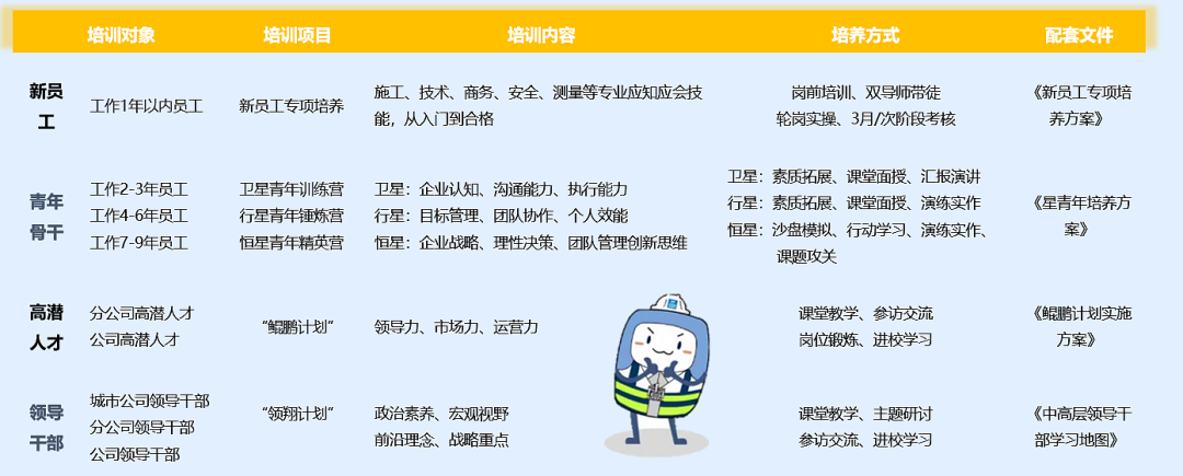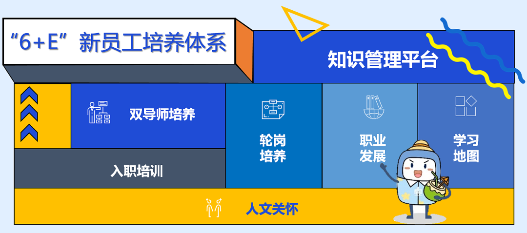 新员工培养:为新员工特别指定“6+E”培养体系,入职后开展为期15天-20天的入职培训,帮助新员工快速了解企业;每位新员工配置职业发展导师和专业技能导师,为期一年的双导师带徒,让新员工迅速进入职场、胜任岗位;多岗位轮岗培养帮助新员工深入了解行业,找准自身发展方向;完善的职业发展体系、学习资源支撑、人才发展环境,让新员工能够快速茁壮成长、成就职业梦想。