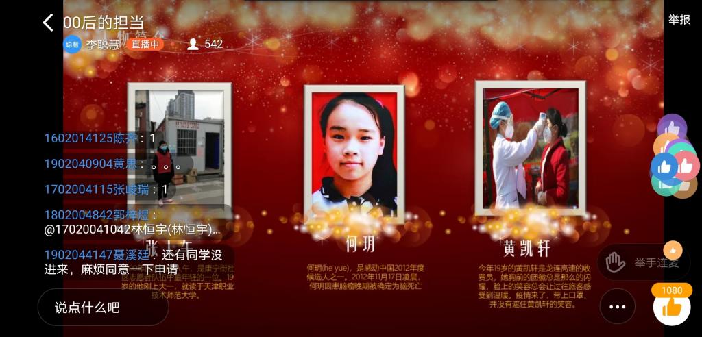 讲堂伊始,李聪慧同学从各个时代背景下人们的担当切入主题,以张人午、何玥、武亦姝等人的故事为例,向大家深入阐述了00后同学们身上所具备的令人敬畏的责任与担当。同时,她结合目前大学生的生活方式,举例论证了当代社会生活中的不良风气对同学们思想健康的毒害。接着,李聪慧同学以“我们年轻人能为这个世界做些什么”为题提问,在大家热情的回应中,她由表及里,逐步深入地阐述了每一位普通人在自己普通的岗位上做一个好人有着非凡的意义,在对一个个鲜明事例的分析中为我们展现了00后的担当。最后,她以“我们不认输,不断追求创意和激情,做我们想做,爱我们所爱!”收尾,鼓励大家不断改进和完善自我,勇敢肩负起时代赋予的重任!在热情不断的点赞中本次致学讲堂完美落幕。