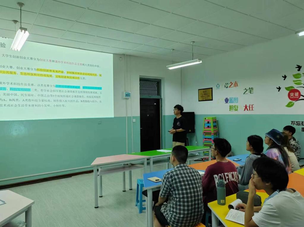 简洁高效的启动仪式结束后,随即开始了训练营的第一部分的第一讲,首讲的内容由项目申报组负责研究生刘锴带来他参与赛事的经历分享。他从参与学校刘鼎杯大赛的经验分享讲起,详细介绍了他一路来参加各种比赛的经历和收获,他希望营员们在生活学习中要主动的发掘发现项目,在项目开展过程中要敢于创新甘于吃苦,在比赛过程中要沉着冷静随机应变。刘锴同学分享的过程中语言干练,幽默诙谐,现场氛围活跃,营员们全程聚精会神,认真聆听。