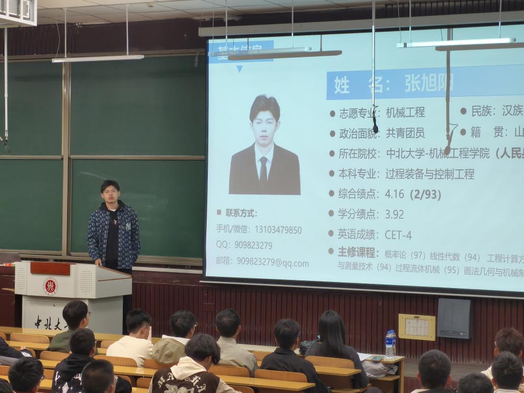 交流分享会第一环节是由4位保研同学分享保研相关经历以及参与科技创新活动对于保研的帮助:首先是奥伟学长就保研经验做出了相关演讲,他首先分析了保研的流程,给同学们梳理了推免时间线,随后为同学们介绍了夏令营、预推免、九推、十推,接着分析了如何选择导师与学校,怎样联系导师、申请夏令营,最后介绍了保研系统的流程和保研细则,他鼓励同学们在保研的路上走下去。然后是樊毓梦学长从课程学习、竞赛生活、科研训练等方面给出了建议,他鼓励同学们多参加竞赛,跟随老师学习做科研了解前沿技术,构建课程体系,提升专业认识,开展学术研究和学术交流,掌握系统深入的专业知识。接着张旭阳学长指出刚进入大学要找到自己的努力方向,并强调了改变思维方式的重要性,提出了努力决定下限、认知决定上限的观点,并指出选择大于努力。郑珂学长也给出了如何提升认知的建议,包括读书和走出去两个方面。第二环节由科协副主席苗成亮同学向同学们介绍了学科竞赛相关知识,他从赛事的选择,组队,备赛,参赛等方面进行了详细的分析,并以三维数字化创新设计大赛为例,详细介绍了Solidworks软件的功能和参赛项目具体完成的过程。接着苗成亮同学又为到场的同学们具体介绍了学院大学生科学技术协会、创想智造实验室等学院学生科技创新组织,并鼓励动员现场同学积极参与其中,提升自己的科技创新能力。第三环节由王子威老师为保研同学颁发“导航学长”聘书,未来学院将聘请保研成功的同学们,为低年级提供学业和科创指导,帮助同学们更好地规划在校学习生活,不断提升其综合素质。