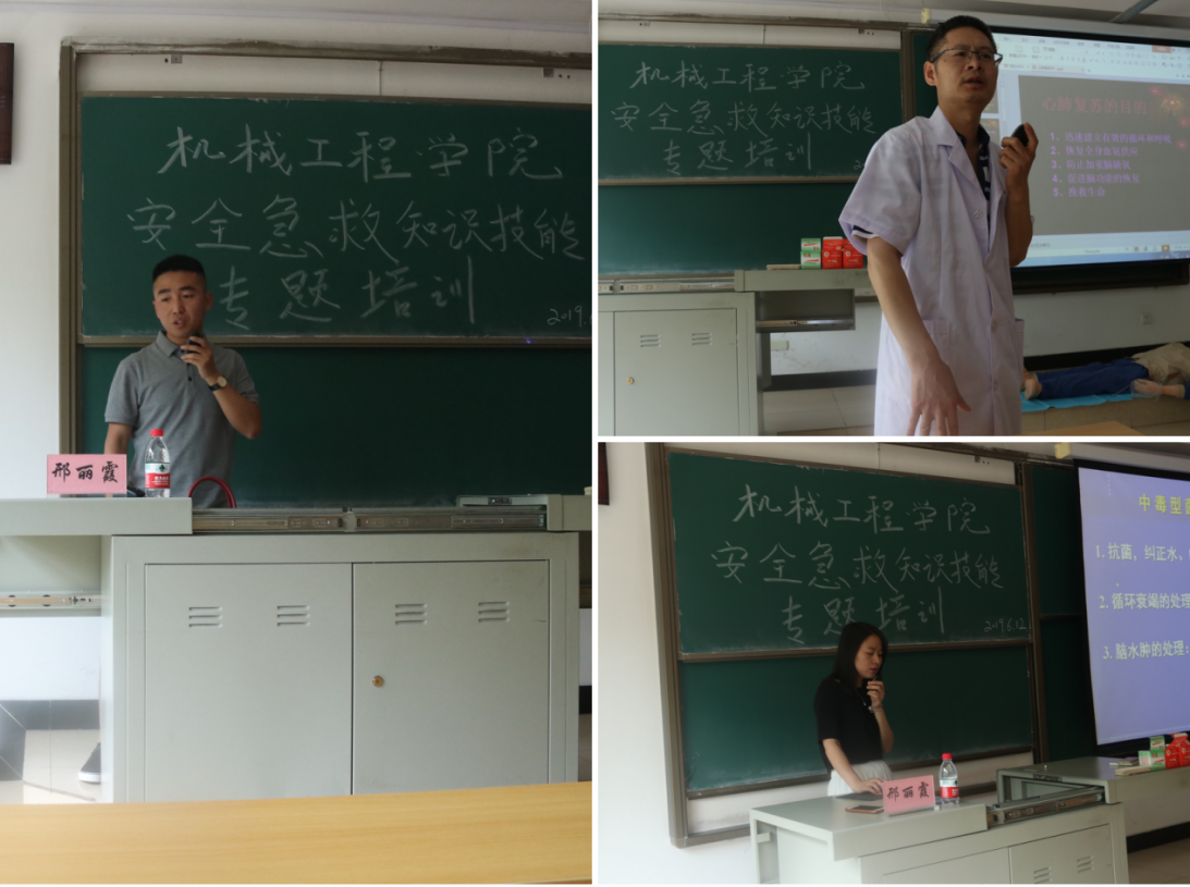 2019年6月12日,机械工程学院在15201教室进行了安全急救知识技能主题培训。本次培训邀请到了校医院勾虎平医生及团队,校医院邢丽霞医生。培训由学生科车建伟老师主持,全院副班长参加培训。