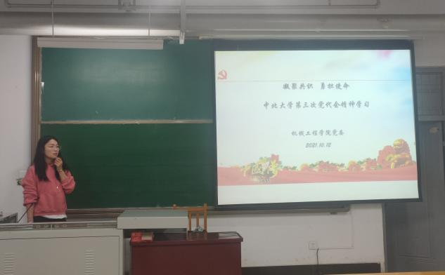 会议开始,李老师从“第二次党代会以来的工作”、“新时期的历史使命与办学思路”、“全面开启新征程的主要任务”、“扎实推进党的建设新的伟大工程”四个方面解读了中北大学第三次党代会精神。回顾往昔,为实现“双一流”大学创建目标,我们已经付出了诸多努力也收获了诸多成果;展望未来,我们依旧任重而道远。作为中北大学的学生,一定要统一思想,凝聚共识,坚定信心,勇担使命,响应校党委的号召,抢抓机遇改革创新,为实现“双一流”大学创建目标拼搏奋斗。