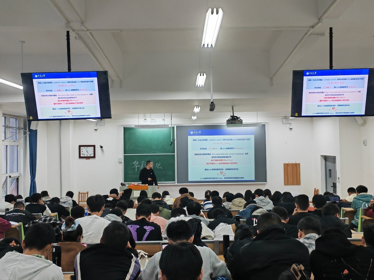 邢老师以“高端装备用钢的开发与性能调控”为主题,结合实际使用工况环境,重点介绍高端装备用奥氏体不锈钢与低密度高强钢的固态相变规律及组织、性能调控方法。在讲解了Super304H奥氏体不锈钢的性质之后,邢老师指出,如今中国早已成为汽车制造和乘用第一大国,所以采用低密度、高性能的Super304H奥氏体不锈钢可以极大地促进车身轻量化。对于家用机动车来说,整车质量降低10%,燃油消耗将降低6%~8%。随后老师从二元亚点阵模型的专业角度介绍了Super304H奥氏体不锈钢轻量化的原因,极大地拓宽了学生们的学术视野。近2个小时的讲座让大家意犹未尽,在讲座的最后,在座的同学们对未来行业发展和奥氏体不锈钢材料问题与邢老师进行了交流学习,同学们收获颇丰。