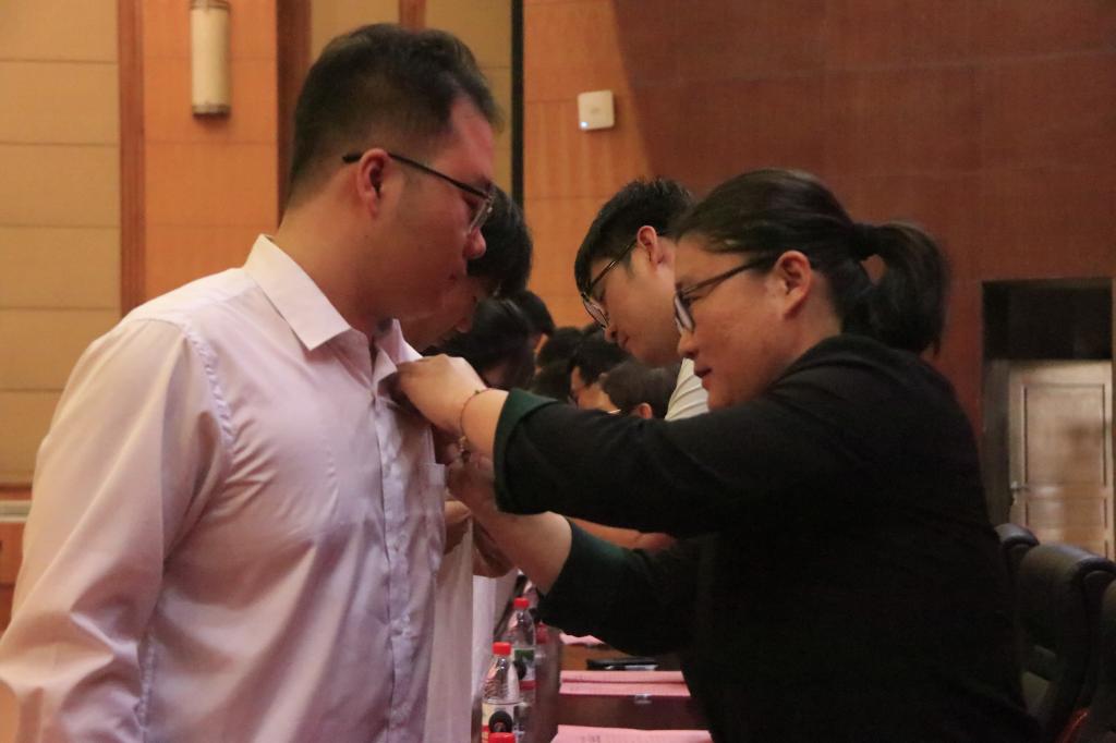 全体与会人员共同观看了本次运动会纪录片《蛰光破茧,励志淬刃》,重温了运动健儿在校运会团结拼搏的精彩瞬间。主席台嘉宾为新入团的团员代表杨洋洋、黄一飞等8名团员佩戴团徽。