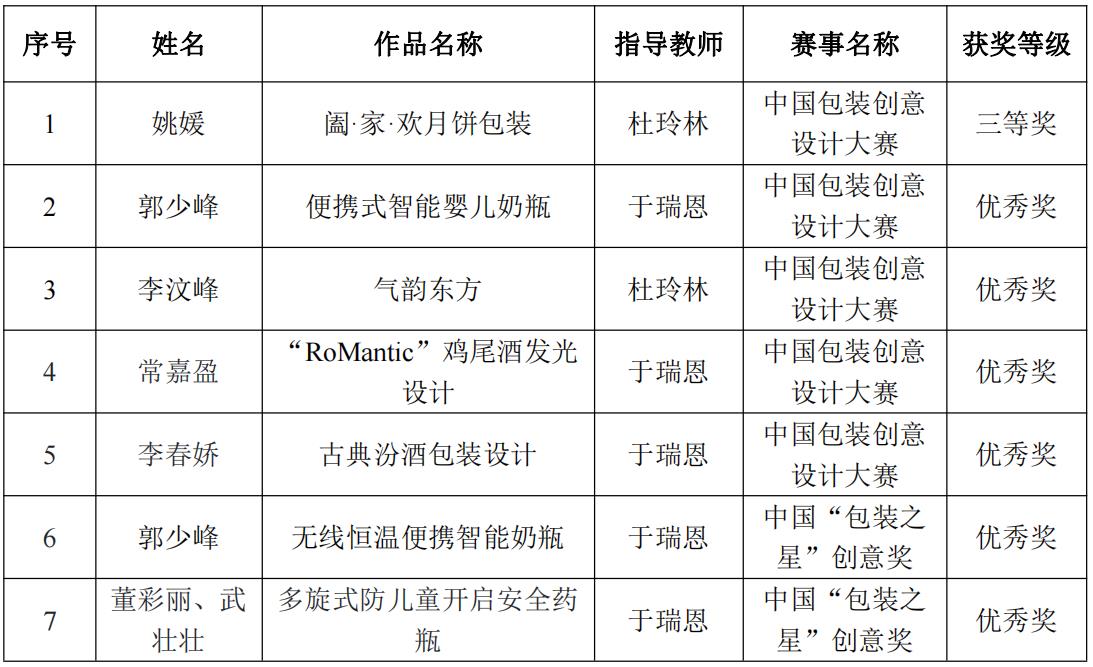 据悉,两项包装设计赛事以贯彻落实国务院对包装高质量发展战略和对中国包装创新创意设计发展的决策部署为目标,以引导和推进我国包装科技进步、创意包装设计、创新包装技术、繁荣品牌文化为宗旨。包装工程系将持续贯彻“以赛促教、以赛促学、以赛促改”的理念,在教学过程中着力培养具有创新精神与实践能力的高素质人才。