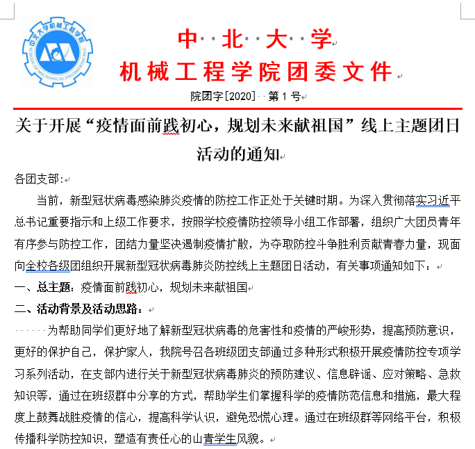 当前,新型冠状病毒感染肺炎疫情的防控工作正处于关键时期。为深入贯彻落实习近平总书记关于疫情防控工作的重要讲话精神,按照学校疫情防控领导小组工作部署,组织广大团员青年有序参与防控工作,团结力量坚决遏制疫情扩散,机械工程学院团支部于3月1日正式开展线上主题团日活动。