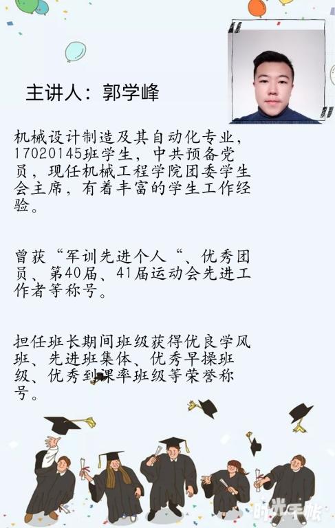 此次线上经验交流会共分为三大部分。会议伊始,郭学峰同学通过畅谈自己的心路历程来向同学们展示自己的成长经历,讲述了他如何从一名普通的学生干部一步一步成为我院学生会主席,并以此向同学们分享了自己的一些见解和经验之谈。随后,他又系统地介绍了我院团委学生会的机构组成及其下设的17个部门的职责和任务,同时鼓励各年级有意愿的同学积极参加到学生工作中锻炼自己,成长自己。最后,郭学峰同学给予了所有参会同学殷切的期盼,他引用习近平总书记给北京大学援鄂医疗队全体“90后”党员的回信中的一句话“让青春在党和人民最需要的地方绽放绚丽之花”, 希望所有人都能够清楚地认识到自己的不足,在自己的“岗位”上认真工作、不断提高,在最需要的地方绽放绚丽之花。