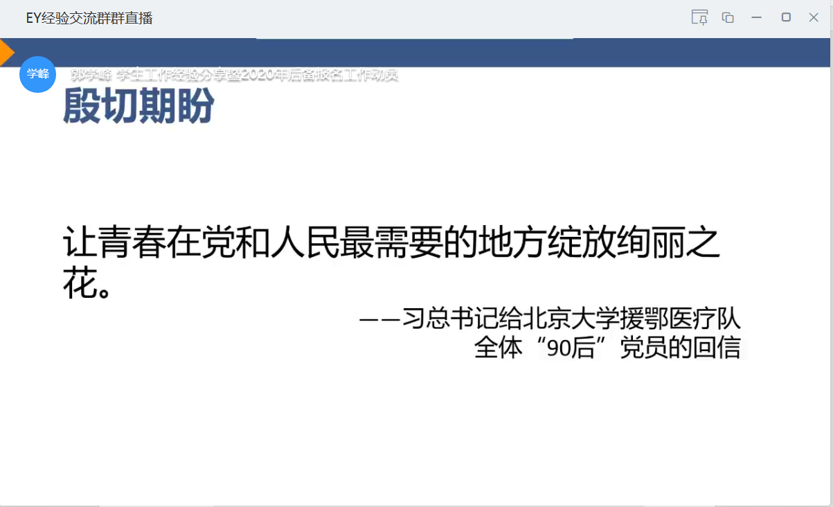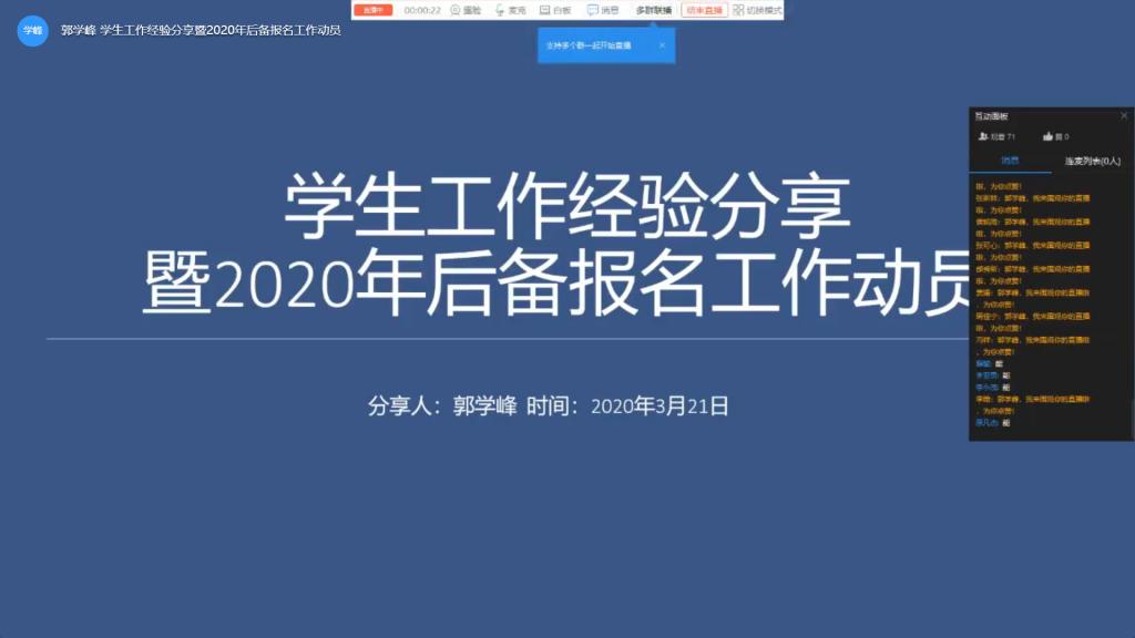此次线上直播交流是在疫情期间开展学生工作的大胆尝试,是网络技术的一次应用探索。后续先进集体和个人的分享会会陆续开展,力争做到停课不停教,宅家不落事。青春是美丽的,我们的步伐是不休止的。