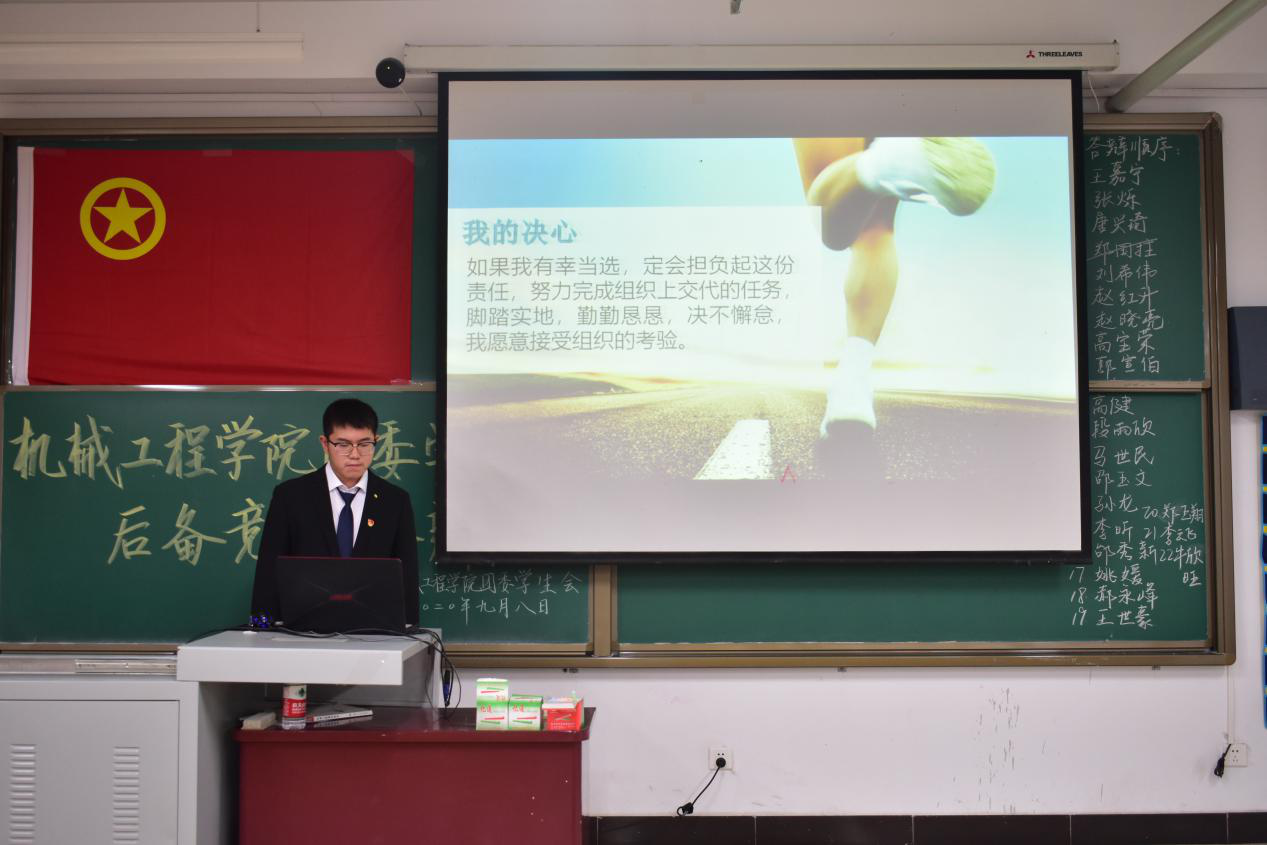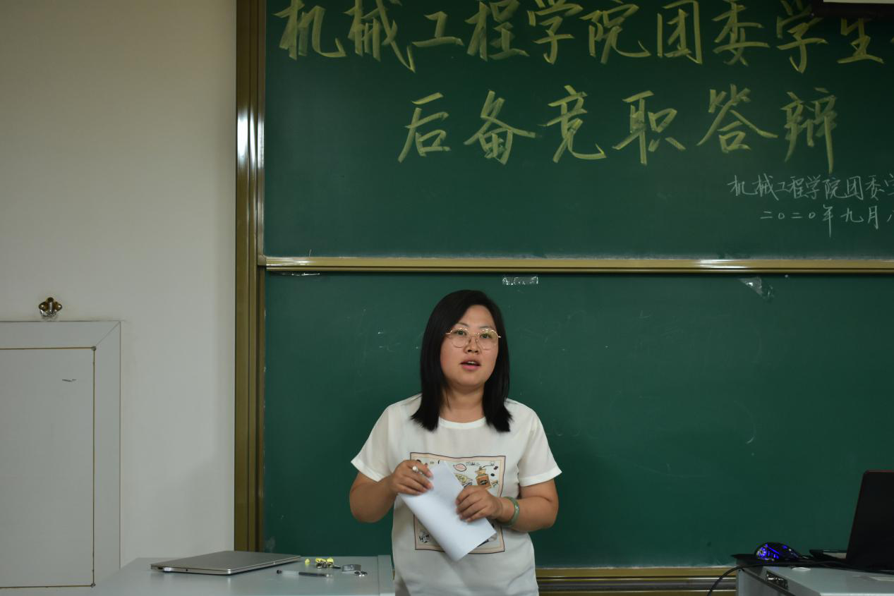 2020年9月8日下午4点30分,机械工程学院团委学生会在15101H教室举行后备竞职答辩。院团委书记王瑾老师、学生科辅导员李沛坤老师莅临现场指导,现任团委副书记、学生会主席等学生干部作为评委参加本次答辩。