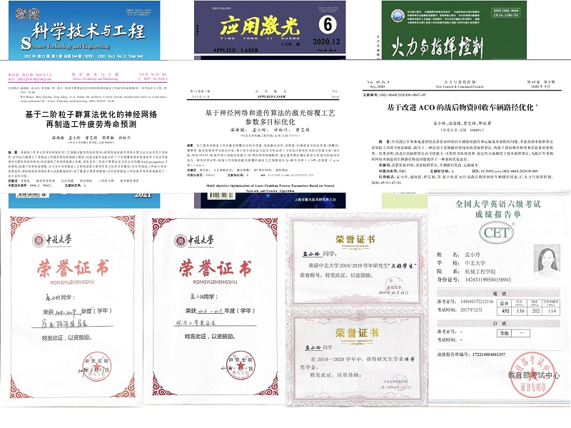 简介:孟小玲,女,机械工程学院机械工程专业2018级硕士研究生,2020级博士研究生,共青团员。读研期间,曾荣获中北大学研究生“三好学生”荣誉称号、中北大学研究生学业奖学金特等奖、综合奖学金二等奖、国家奖学金等。以第一作者发表一级核心论文1篇、录用1篇;以第二作者发表中文核心论文2篇;以第一作者申请山西省研究生教育创新项目1项。