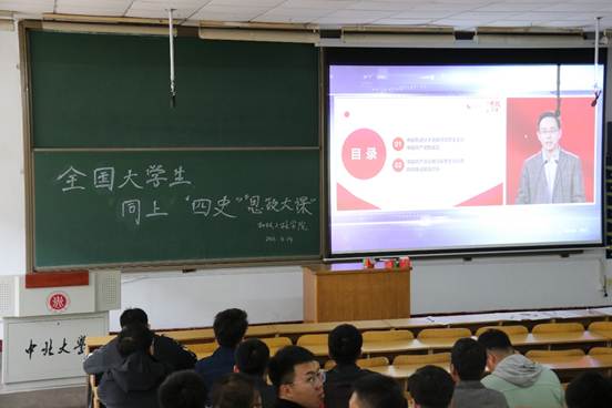 2021年4月24日下午14:00—15:30,为深入贯彻落实习近平总书记关于深化思想政治理论课改革创新和“大思政课”的重要指示批示精神,全面落实习近平总书记在党史学习教育动员大会上的重要讲话精神和《中共中央关于在全党开展党史学习教育的通知》的部署安排,以及《教育部社科司关于组织全国大学生“同上‘四史’思政大课”的通知》要求,教育部社科司与人民网联合举办“同上‘四史’思政大课”活动,学院组织在08101H观看了《同上一堂四史思政大课》的第一课。