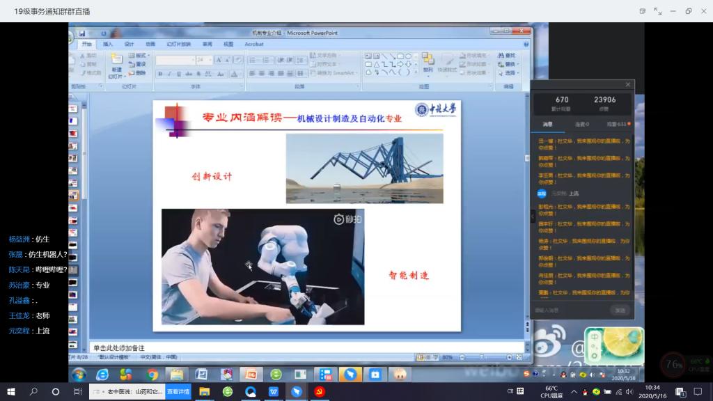 为适应社会发展需求,激发学生学习的主动性、自觉性和创造性,在“以人为本、夯实基础、强化实践、突出特色、提高教学质量”的指导思想下,中北大学机械工程学院19级机械大类专业分流线上宣讲会于2020年5月16日上午十点顺利开展。本次宣讲会依托钉钉平台开展,机械工程与自动化系主任杜文华老师、机电与控制工程系主任赵俊生老师、副主任高强老师担任主讲人,机械类600余名同学在线观看。