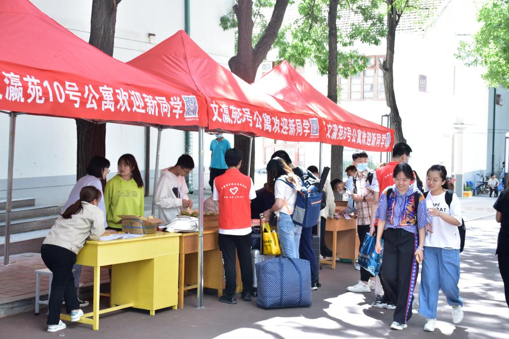 在学院新生报到点,参与注册登记工作的学生干部有条不紊地为新生办理入学手续,由学生党员队伍组成的志愿者队伍,引导员带领每一位前往公寓楼下完成住宿登记,同时现场机动组工作人员为新生家长介绍着学校、学院的相关情况。整个流程分工周密,严谨高效。
