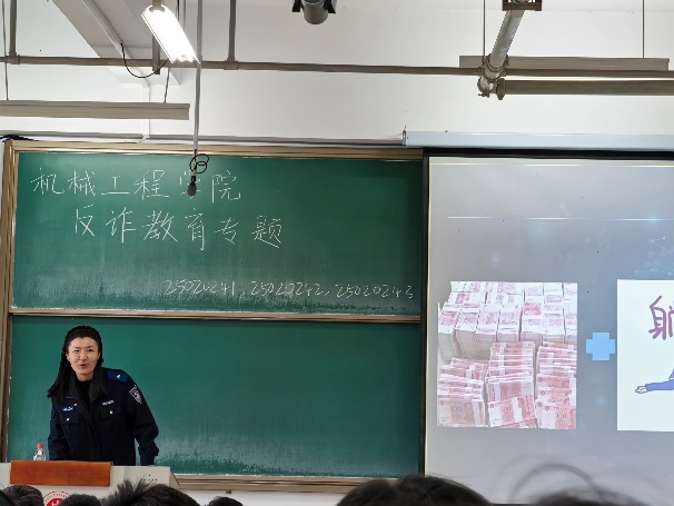 为增强师生防范意识,提高反诈能力,机械工程学院于2025年10月17日星期五在15410H教室举办防诈骗专题教育讲座。本次讲座特邀综改分局刑侦大队高雅婷警官担任主讲,边国旗老师,王子威老师及25级机电班级全体同学参加活动。