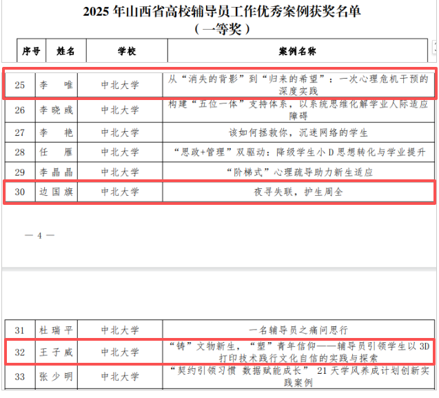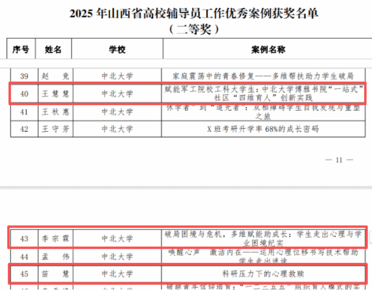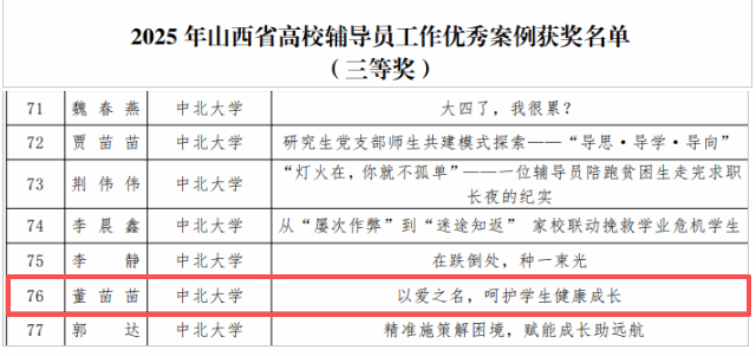 近日,山西省教育厅公布2025年高校辅导员工作优秀案例评选结果,我院辅导员团队凭借突出的育人实践与创新探索斩获佳绩,共获7项省级荣誉,其中王子威、边国旗、李唯三位老师摘得一等奖,苗慧、王慧慧、李宗霖三位老师获二等奖,董苗苗老师获三等奖。值得关注的是,学院一等奖获奖数占全校一等奖总数的三分之一,获奖总数位居全校院系前列,实现了获奖数量与质量的双重突破,充分彰显了学院辅导员队伍建设的显著成效。