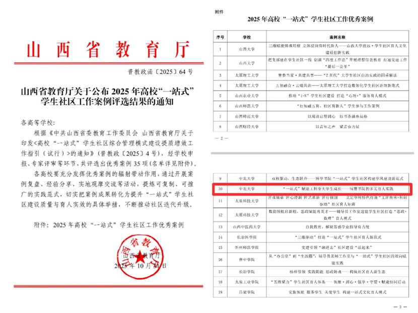 近日,中北大学博雅书院申报的《“一站式”赋能工科女大学生成长-博雅书院多元育人实践》实践案例,荣获山西省2025年高校“一站式”学生社区工作优秀案例。