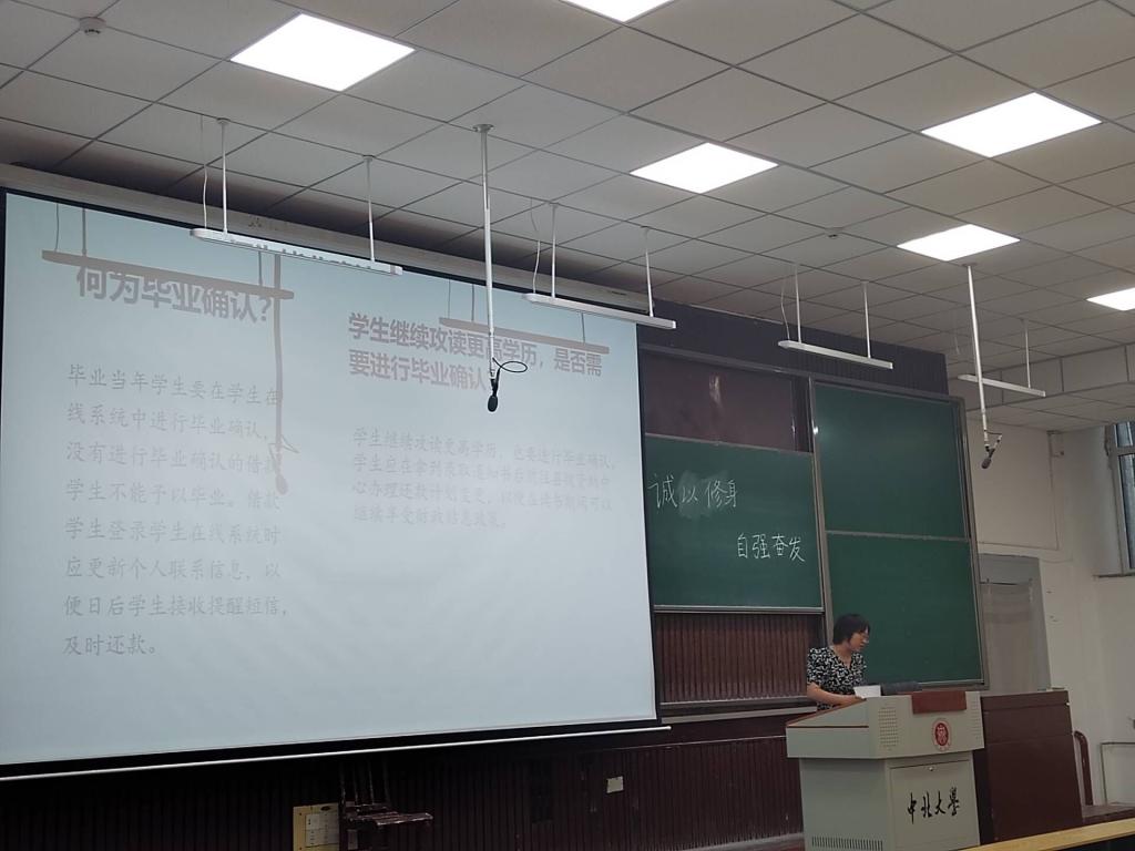 会议由王慧慧老师向同学们详细讲解了助学贷款还款的相关注意事项,还款流程等方面,从各项流程到可能出现的问题与解决方法进行了详细讲解,并着重强调了需要交回的材料。用多事例多角度着重强调:按期还款的重要性以及失信对个人的一系列影响。最后,王慧慧老师向毕业生发出诚挚的祝福,祝愿大家前程似锦。