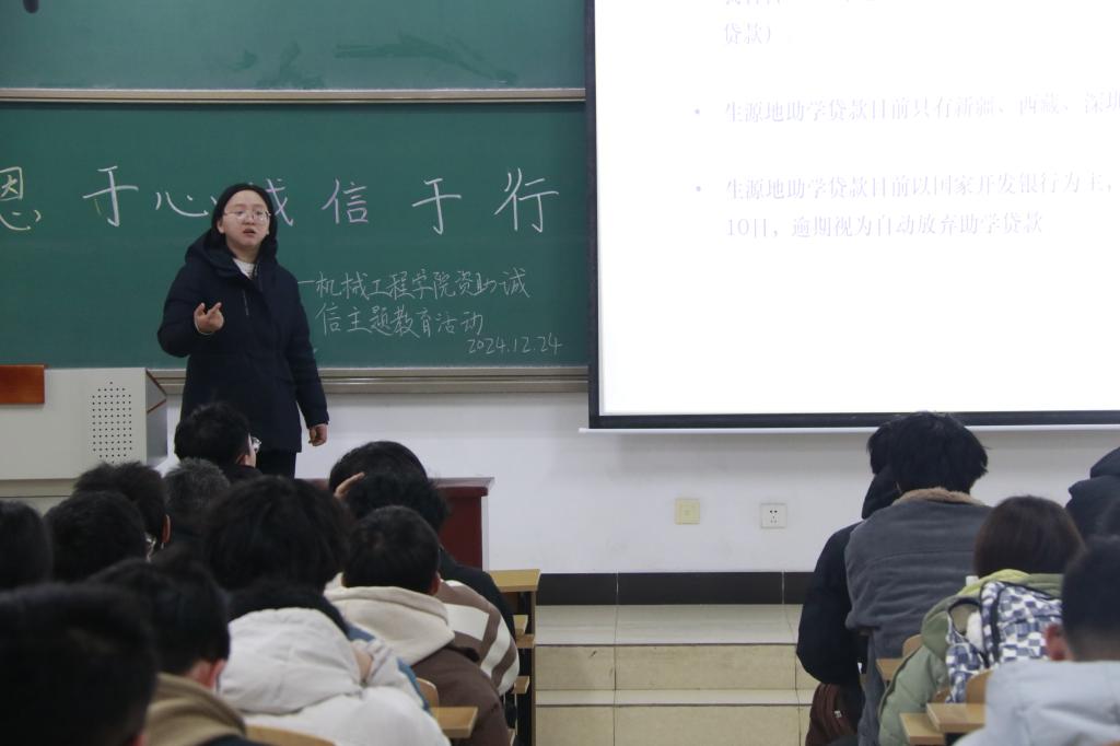 为了进一步引导学生确立正确的人生观和价值观,并且培养社会责任感,机械工程学院勤工委员会于2024年12月24日下午4点,在15109H教室召开了资助主题教育大会。出席此次大会的有学生科资助辅导员王慧慧老师、励志学生代表、勤工助学委员会全体成员、24级全体生活委员以及经济困难学生。