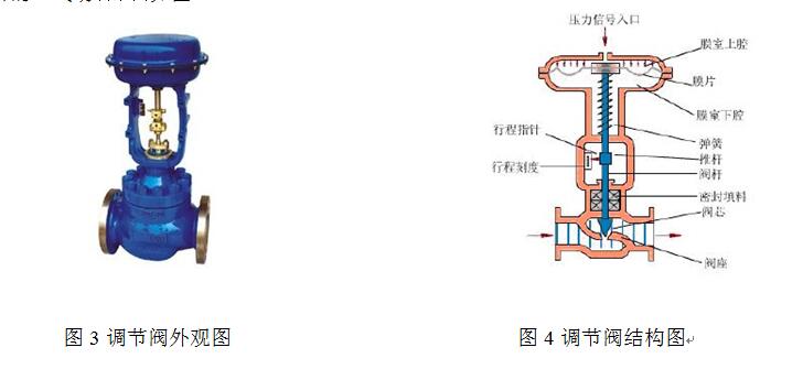 当来自控制器的信号压力通入到薄膜气室时,在膜片上产生一个推力,并推动推杆部件向下移动,使阀芯和阀座之间的空隙减小(即流通面积减小),流体受到的阻力增大,流量减小。推杆下移的同时,弹簧受压产生反作用力,直到弹簧的反作用力与信号压力在膜片上产生的推力相平衡为止,此时,阀芯与阀座之间的流通面积不再改变,流体的流量稳定,可见,调节阀是根据信号压力的大小,通过改变阀芯的行程来改变阀的阻力大小,达到控制流量的目的。气动调节阀如图。