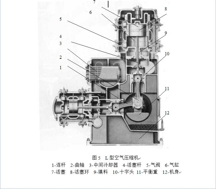 图5所示为一台往复压缩机的结构示意图。机器结构为L型,两级压缩。图中垂直列为一级气缸,水平列为二级气缸。可以把图中零件分为四个部分: