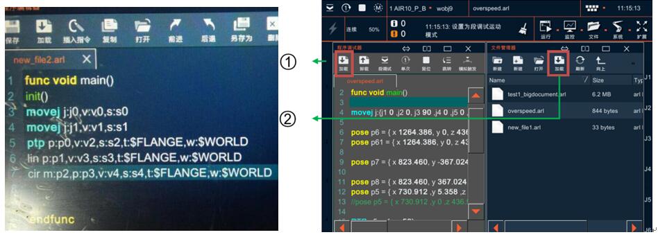 AIR控制系统主界面可以监控系统状态、当前加载的程序、各轴运动角度,法兰中心点的坐标。可以建立新的运动控制程序;可以通过U盘加载新文件,实现系统的升级。