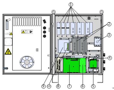 控制柜。控制柜主要有两种类型,传统型控制柜和集成控制柜,其中集成控制柜是将传统控制柜进行了集成,包含传统控制柜的所有模块。传统控制柜主要包括1-驱动器、2-扩展驱动器、3-断路器、4-接触器组、5-安全模块、6-电源转接板、7-PLC_INT、8-PLC_MF、9-工控机、10-AEMC1200运动控制卡十个部分组成。