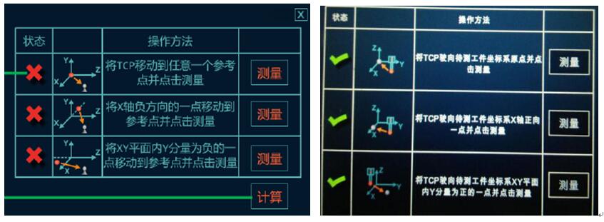 f. 点击右侧测量,选择三点法,再依次测量,绿色对勾表示成功。注意,第一次测量同于四点法,第二次只需在xoy面上移动到某一点,第三次测量以前两次为基础,同样在xoy面移动建立右手系确定第三点的大概方位。使各个坐标系统一。点击计算,保存,建立成功