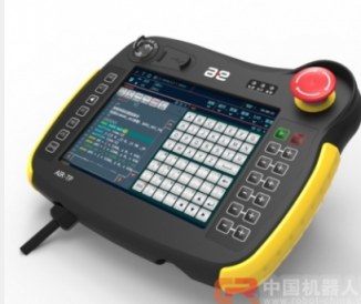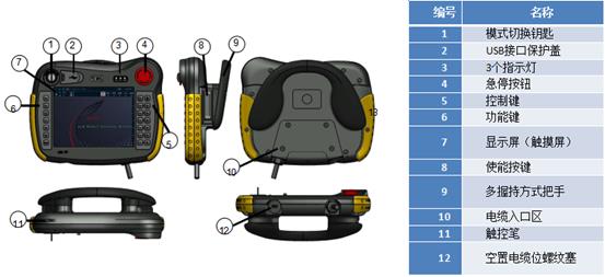 示教器。教器可以操控机器人手动、自动运行,记录示教点并编程。示教器主要包括急停按钮、使能按键、模式切换钥匙、显示屏、按键等。在对机械手进行“手动模式”操作过程中,示教器的手持方式固定,即左手托持示教器,四指放在“使能”按键上。
