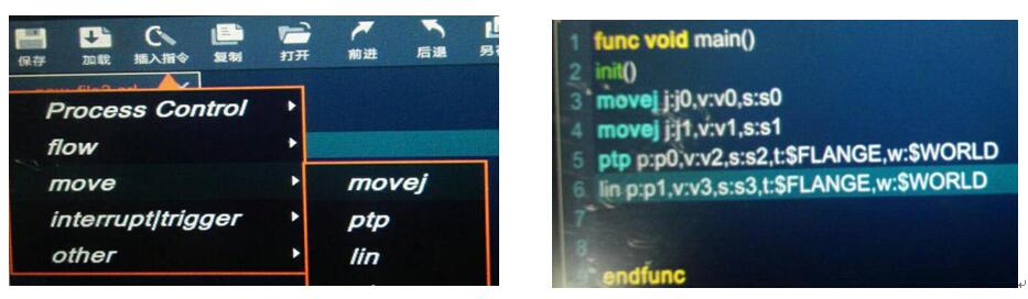 h. 插入move指令:movej(移动关节),ptp(点到点),lin(直线),cir(圆弧)。