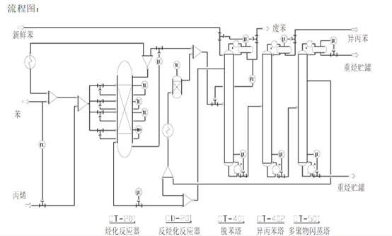 生产产品主要原料为苯和丙烯,这两种原料都是由燕山石化其他厂通过管道直接输送至厂区,储存在罐区的储罐中。氧化工段中所需要的空气由压缩机直接从外界获取。公用工程主要使用370℃的饱和水蒸气,由燕山石化锅炉厂提供。 通过与高等院校合作,从1992年起开展了以分子筛做催化剂合成异丙苯的研究工作,1998年利用这一研究成果,对原有的SD法生产异丙苯的装置进行改造。改造后运行数据表明,装置节能降耗效果显著,“三废”排放大幅度降低,实现了化工污水的零排放,在8.5万吨/年异丙苯装置,年节约蒸汽4.35万吨,年节约用点210.12wk·h,节约用水7.47万吨。