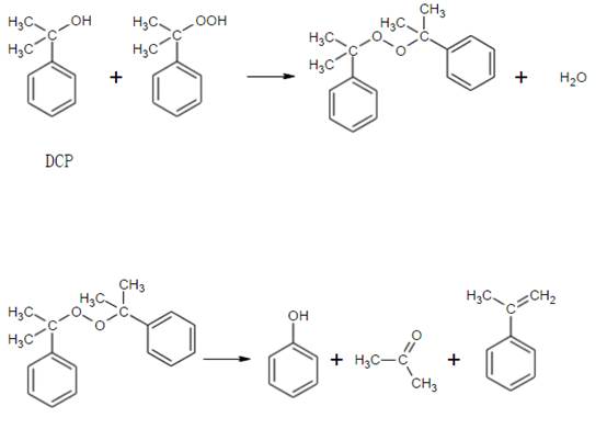 新鲜异丙苯加入提浓精馏塔塔顶,作为该塔回流液,塔底物料经压差送入二段提浓器(PT-6),塔顶气相物料经冷凝器冷凝后回流回氧化塔。塔底提浓后的CH液进入分解反应器。