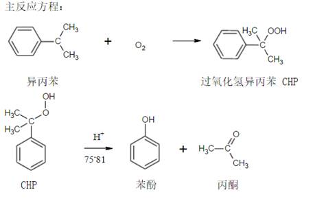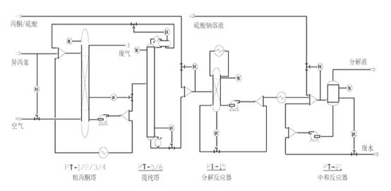 来自烃化工段新鲜异丙苯,来自提浓塔顶的冷凝液送入进入氧化塔(PT-1/2/3/4)。 由压缩机送来的新鲜空气碱洗后进入氧化塔塔底。塔底的氧化液(含CHP 22~35wt%),部分送入提浓塔,大部分经冷却器冷却后回流回氧化塔,控制反应温度。塔顶尾气(含有水、有机酸)经催化燃烧后排入大气。