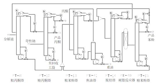 分解液首先从粗丙酮塔(PT-8)塔顶分离丙酮、水和比苯酚轻的组分作为精丙酮塔(PT-10)的进料,在PT-10用苛性钠处理除去醛类等低沸物,塔顶馏出物作为分解反应器用的丙酮,侧线采出产品丙酮,塔釜液送到回收工段。