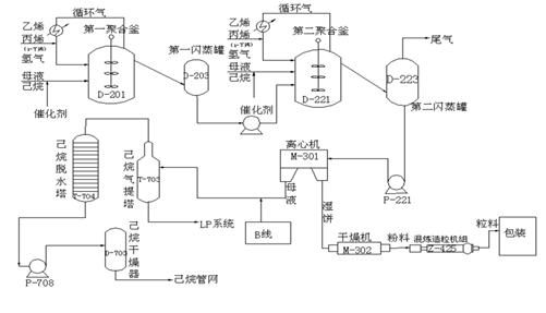 聚乙烯在大量的活性种上进行聚合,形成细小的颗粒,与溶剂己烷一起称为淤浆。浆液经过闪蒸脱出未反应的原料气后,进入离心机在离心力的作用下将固液分离,聚乙烯湿饼(含30%己烷)进入干燥机,通过蒸汽加热干燥成粉末,与一定配比的稳定剂混合后进入混炼造粒机造粒,得到聚乙烯颗粒产品。从离心机分离下来的液相(母液)经过蒸馏塔脱除低聚物、精馏塔脱除水后得到含水量小于5ppm的新鲜己烷循环使用。