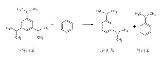 脱苯塔侧线采出干苯与多聚物闪蒸塔侧线采出二异丙苯及三异丙苯经混合器(A-202)混合后经预热器(CE-209)预热后进入反烃化反应器。从反应器出来的反烃化反应液与烃化反应液后经混合器(A-203)混合后进入脱苯塔作为进料。