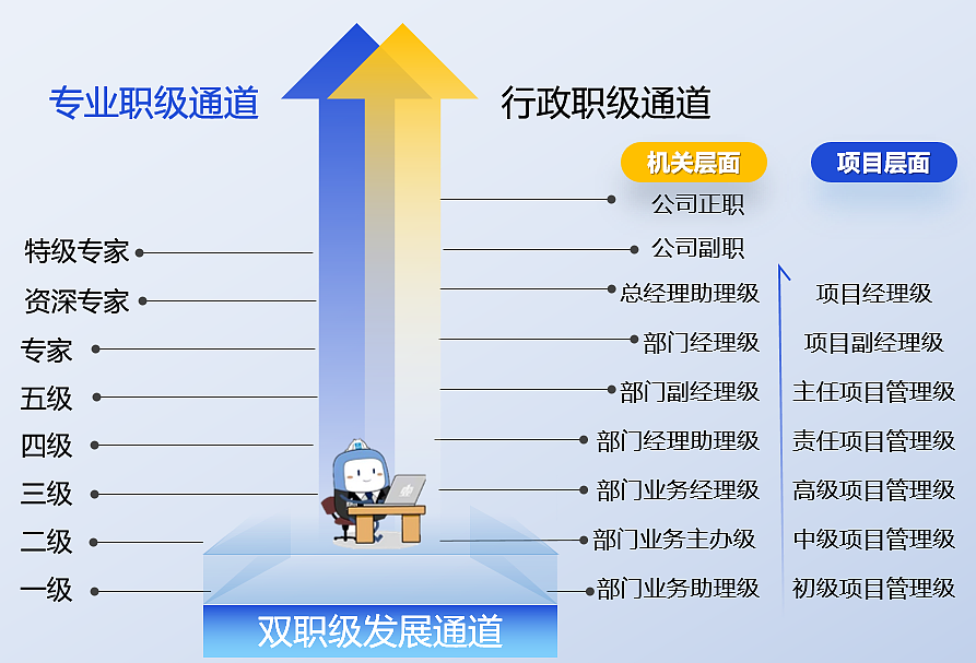 职业发展:以专业序列、管理序列并行的双职级职业发展通道,奠定通畅的员工职业发展通道;4级机构3000余个项目副经理以上管理岗位、生产和职能20余条专业序列,科学的考核、评价和晋升机制,为员工带来充足、公平的职业发展机会。