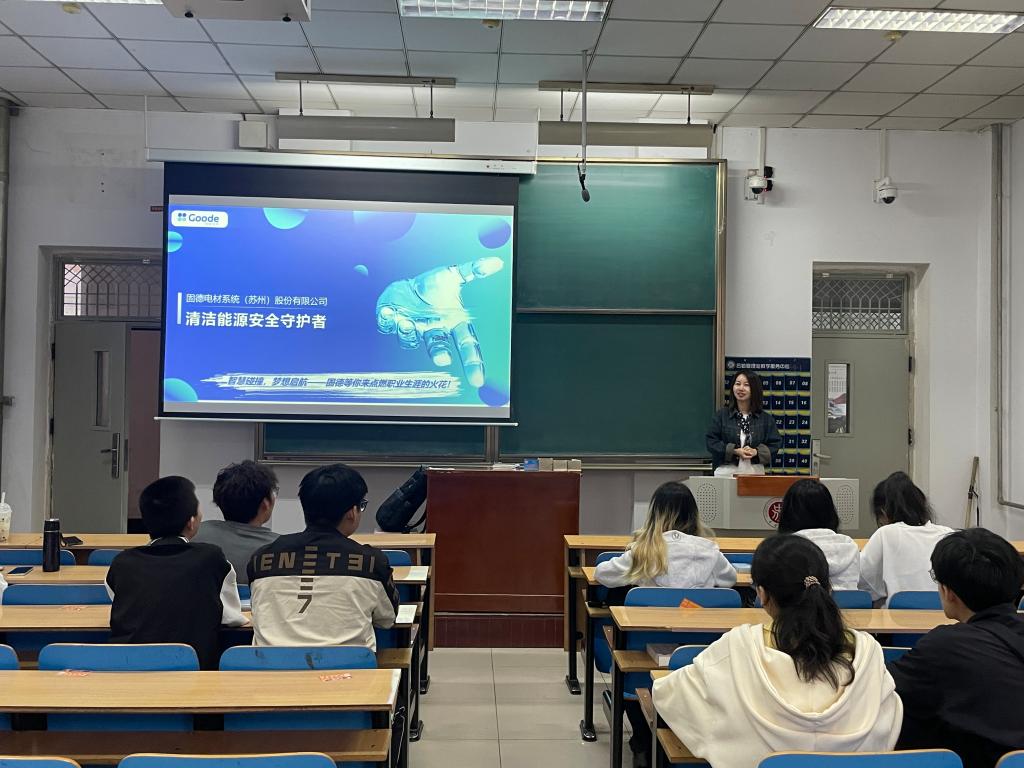 宣讲会伊始,以一段中北学子在固德的工作生活的介绍视频开始,视频中学长学姐们通过介绍他们的工作环境、休闲娱乐等多方面简单了解了固德电材系统(苏州)股份有限公司。随后固德电材人力资源部的张燕萍经里围绕固德的地理位置、人文景象、主营业务、公司前景等全方位的介绍了固德电材系统(苏州)股份有限公司。