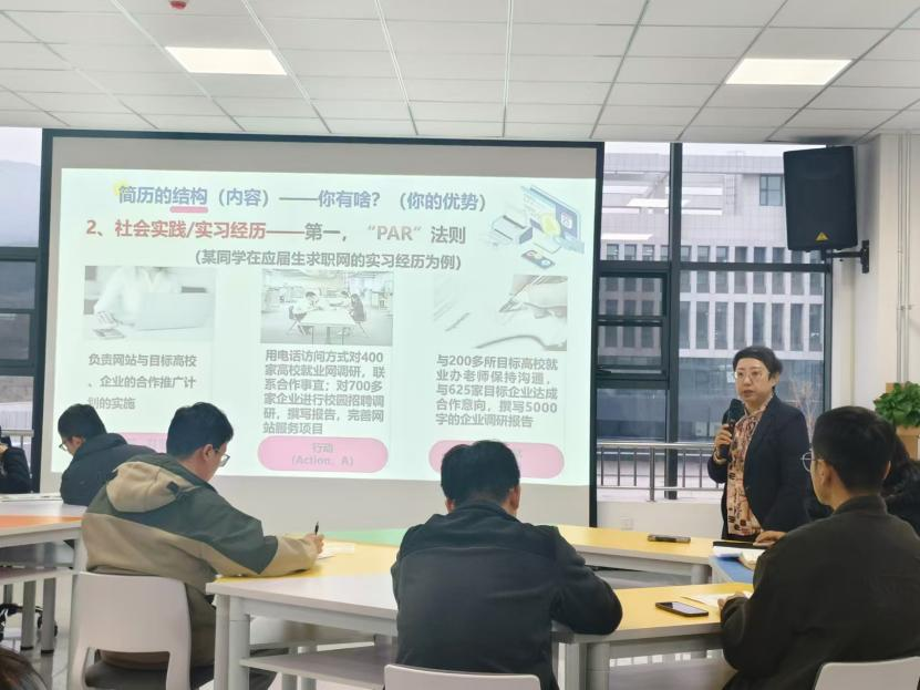 李秀玲老师从简历布局技巧、结构设计、用词技巧等方面,系统全面地给在座研究生进行了讲解,在座的学生受益匪浅。讲座中,李老师就简历中科研经历的撰写采用“PAR”法则进行了详细讲解,指出从问题、背景——行动——结果、成就三个方面就自身的科研实践经历进行凝练提升展示个人能力水平。