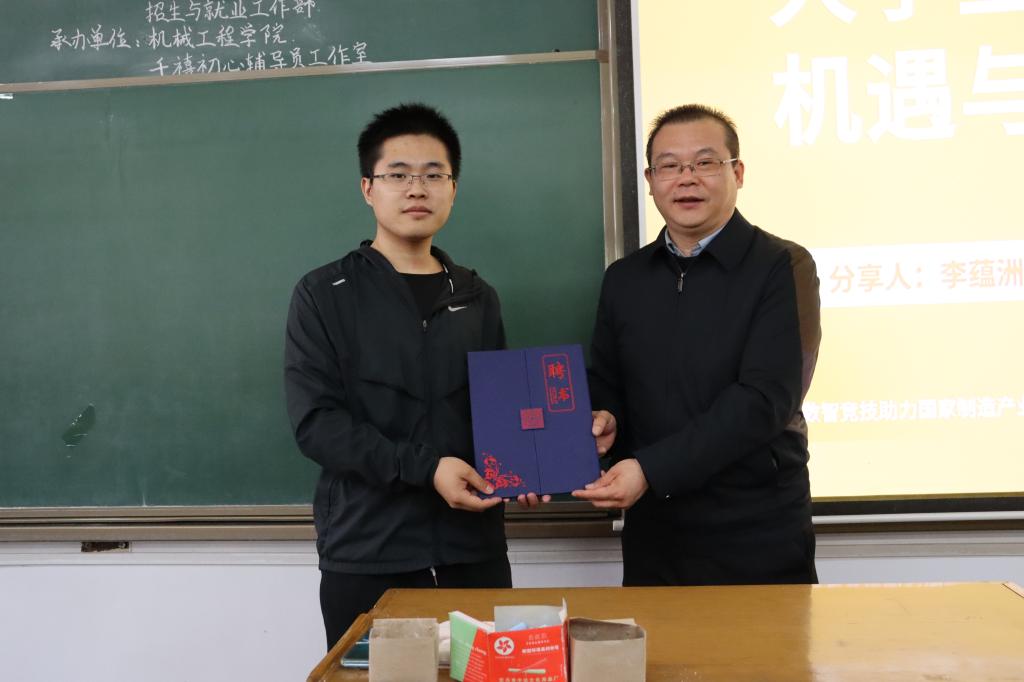 座谈会后,玄智科技创始人李蕴洲受邀担任第2期中北大讲堂——《大学生创新创业的机遇和挑战》主讲人,于08101教室与同学们分享个人的创新创业经历,他的分享内容主要包含创新项目、比赛经历以及创业契机,强调创新创业过程中团队合作的重要性,勉励同学们要善管理,善学习,善协作。活动最后,机械工程学院党委书记孙旭东代表学校为李蕴洲颁发了中北大学职业发展与就业创业导师聘书。