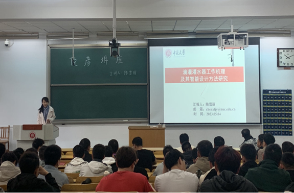 陈雪丽老师以“滴灌灌水器工作机理及其智能设计方法研究”为题进行分享。首先,陈老师介绍了灌水器的发展现状、面临问题及探究意义,吸引了全体同学们强烈的好奇心。紧接着,向大家介绍了滴灌灌水器水力性能的一些研究方法,介绍了压力补偿灌水器的流固耦合数值模拟研究、水力性能的评价指标及优化目标、可视化堵塞实验设计以及基于机器学习的灌水器智能设计平台研发;最后,同学们向陈老师仔细请教自己不清楚的地方,陈老师耐心的给出了解答。