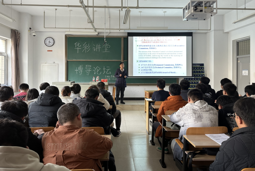 李瑞琴教授以“机械工程领域的国际学术组织及设置的重要学术奖项”为主题,介绍了机械工程领域含金量较高的会议以及奖项。李老师对机械工程专业的地位及优势所在展开说明,重点介绍了机构与机器人学领域的国际学术组织及设置的学术奖项、重要国际学术会议等,让同学们对该领域有了更高层次的认识以及就如何查阅重要的文献资料给出了很好的方法。最后,同学们向李教授仔细请教了自己不清楚的地方以及遇到的问题,李瑞琴教授耐心的一一解答。