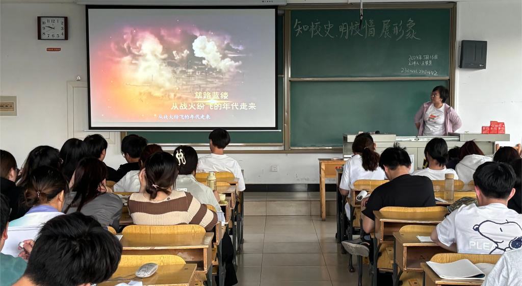 班会伊始,王慧慧老师组织大家学习了学校创办的校史校情、带领大家了解了学校的学科发展及学校取得的重大成就,展示了中北大学从太行工业学校到如今的全国知名高校的蜕变与成长,回顾了厉瑞康院长为中北大学奋斗的一生以及那段激情燃烧、无怨无悔的岁月。随后,王慧慧老师向大家介绍了校庆期间的主题活动安排,号召同学们积极参与校庆系列活动,并提醒同学们在校庆期间将有全国各地的校友陆续奔赴学校参加校庆活动,要做到“知礼、懂礼、用礼”,展现中北学子应有的精神面貌。