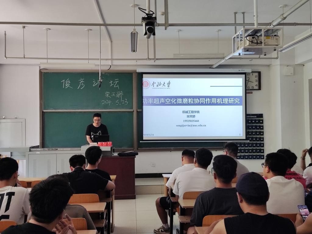 宋天骄老师以“功率超声空化微磨粒协同作用机理研究”为题进行分享。首先,宋老师介绍了功率超声空化微磨粒协同作用机理的战略背景、发展现状、面临问题以及探究意义,吸引了全体同学们的注意。紧接着,向大家介绍了功率超声空化微磨粒协同作用的理论研究,重点介绍了功率超声化微磨粒的作用、空化效应中流场压强分析以及空化效应中液流速度矢量分析。最后,宋老师详细的向同学们讲解超声空化微磨粒协同加工微位移平台的研制过程,并着重介绍通过对功率超声空化微磨粒协同作用试验研究得到的成果。讲座结束后,同学们向宋老师仔细请教了自己不清楚的地方以及遇到的问题,宋天骄老师耐心的一一解答。