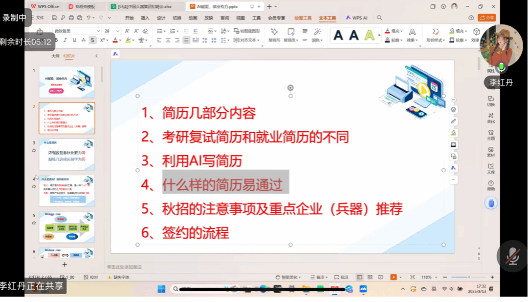 2025年9月13日,机械工程学院就业辅导员李红丹老师面向大四学生开展“AI赋能、就业有方”线上简历指导专题讲座,讲授简历撰写技巧,助力毕业生提升求职竞争力。