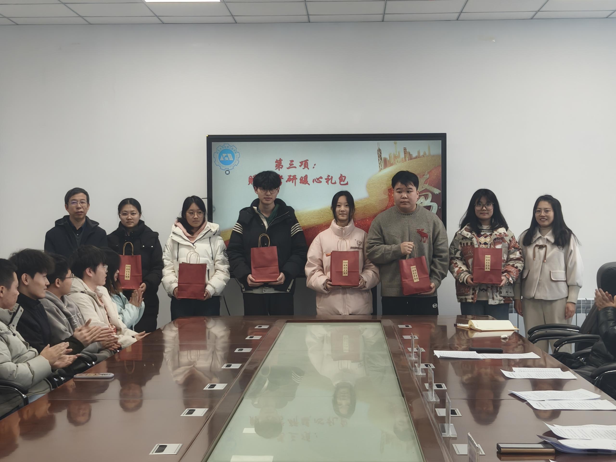 活动伊始,学院领导与老师们共同为考研学子逐一递上精心筹备的“考研暖心礼包”。每一份礼包都满载着学院的深情厚谊与美好祝愿,寓意“一战成硕”、“笔下生花”。在温馨的氛围中,现场老师们同同学们亲切交流,详细了解大家的备考状态与生活情况,并叮嘱同学们在最后阶段要劳逸结合,保持身心健康。院长祝锡晶在与同学们交流时勉励同学们要科学备考、注重方法,在最后的冲刺阶段保持稳健的节奏。同时,他希望同学们树立必胜信心,以最好的精神面貌迎接考试。党委书记孙旭东在随后的简短寄语中,对同学们持之以恒的奋斗精神给予了高度肯定,并鼓励大家要稳住心态、沉着应考,以最佳状态迎接挑战。