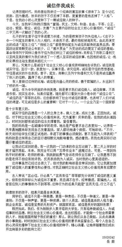 日前,全省大学生学习践行社会主义核心价值观主题征文评选结果揭晓,为响应部、省高校工委、共青团省委的号召,我院学子积极参与,其中15020242班岳超同学凭借《诚信伴我成长》一文,从100篇各学校上报的作品中脱颖而出,获得本次大赛一等奖。