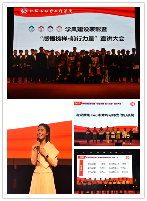 3月14日晚,机械与动力工程学院2017年学风建设表彰暨“感悟榜样·前行力量”宣讲大会在科艺苑隆重召开。学院全体领导、学科管理部主任、副主任、获奖老师代表、专职辅导员、班主任参加此次大会。