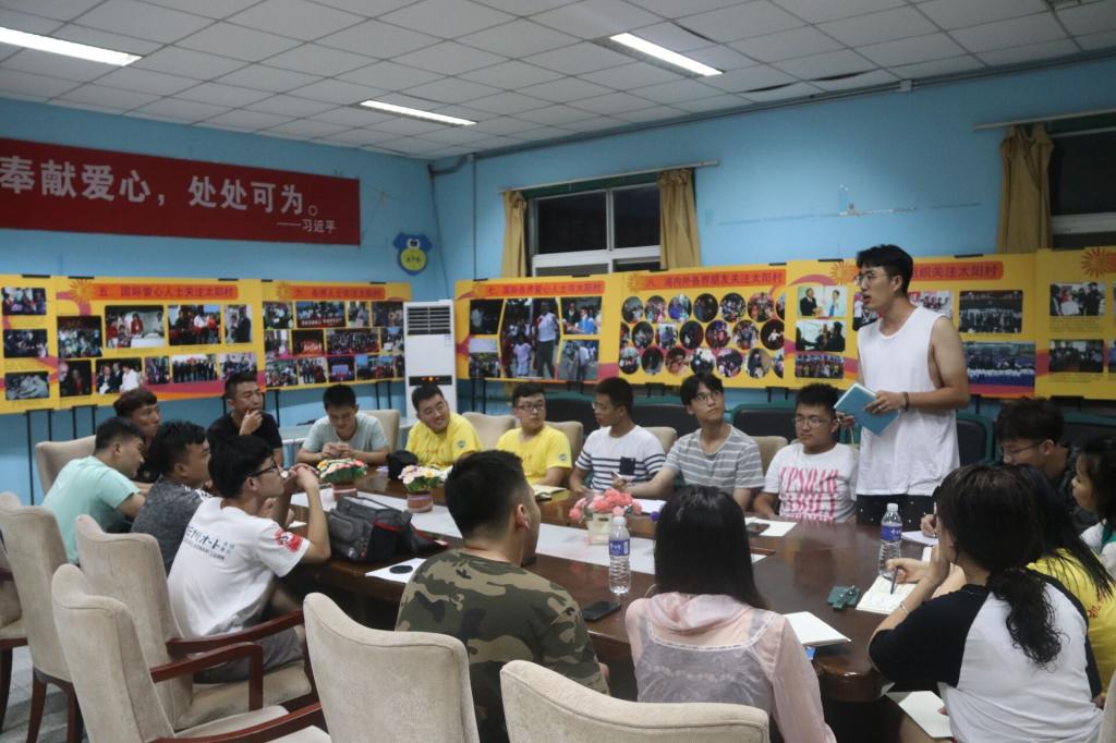 在晚上的例会中,车老师与调研队员们先对今日调研情况进行了总结和个人感悟发言。再由村内队员对今日的活动进行了总结汇报。在总结汇报和感悟发言中,队员们互相学习,从他人的感悟中,看到自己的不足,从而反思。随后车老师就队员们的总结汇报和感悟,进行了总结并提出了今天较为重要的问题:上午在队员们辅导孩子过程中遇到人力不足造成顾及不周,孩子因此产生消极情绪从而影响了辅导效益。对此队员们再次展开了讨论,并根据明天的计划安排做出了辅导的人员以及方法调整。会议最后,队员们确定了明天的大致安排。例会结束后,队员们仍然抓紧着时间进行了节目排练。